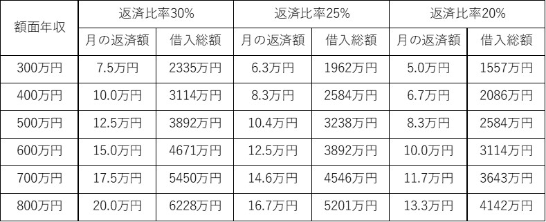 一般的には借りれる金額は返済比率30%、返せる金額は25%以下となっています。