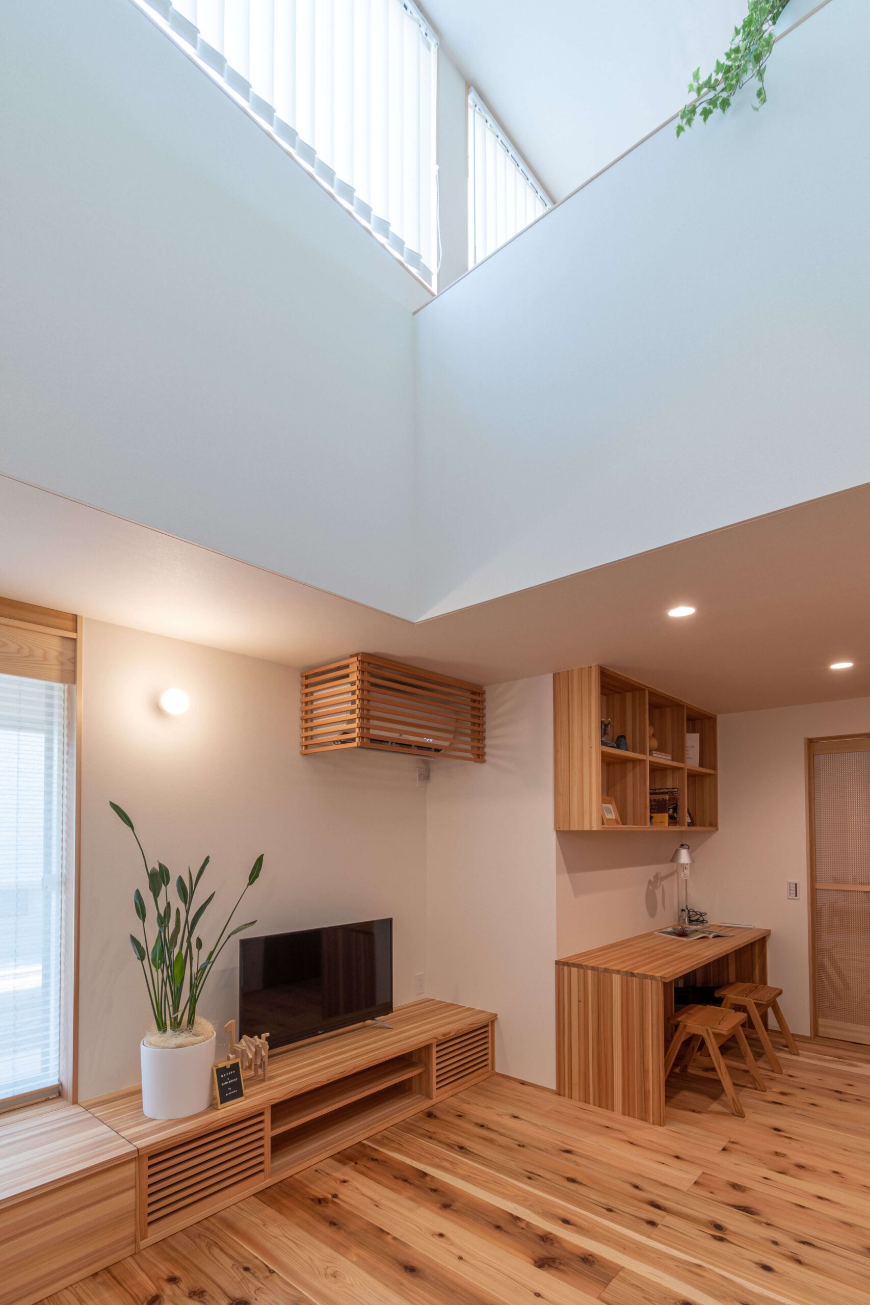 ・ウッドタイル ・壁面収納 ・折下げ天井 ・間接照明 ・造作洗面台 ・1階寝室 ・家事動線 ・アイアン手すり