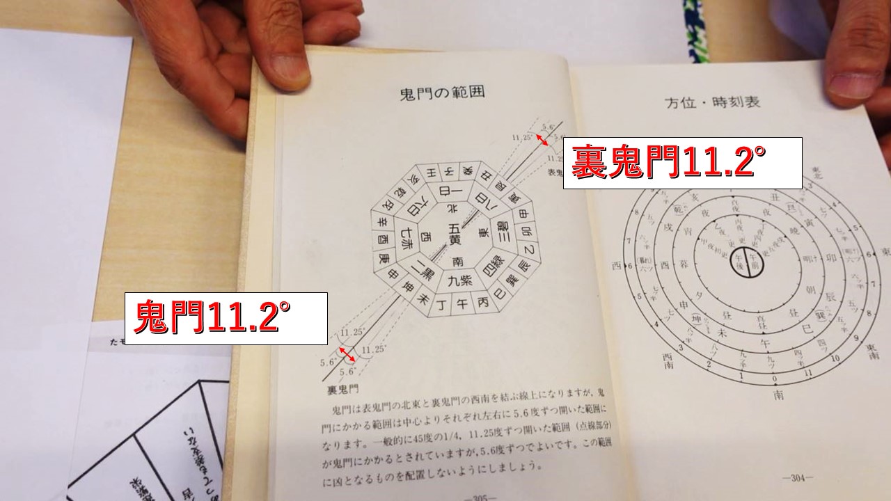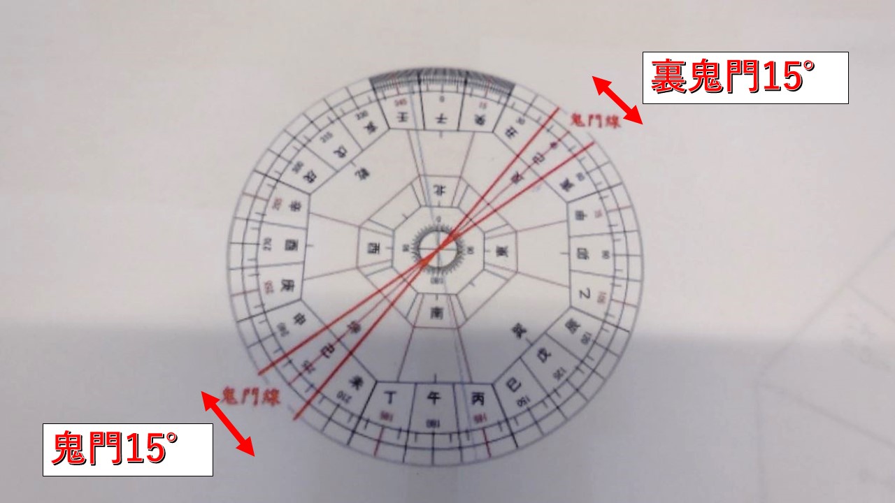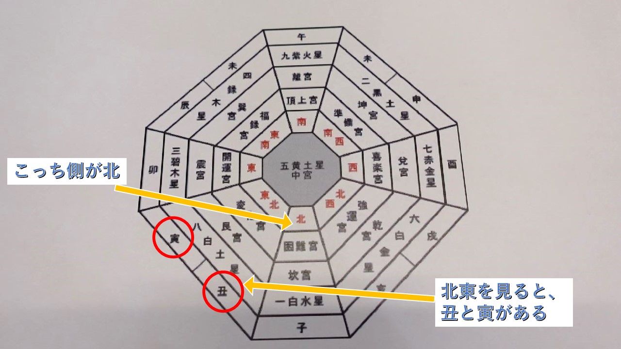 ちょっとこれを見てください。こっちが北で、東北の方角を見ていただくと「丑」と「寅」が書かれていますね。