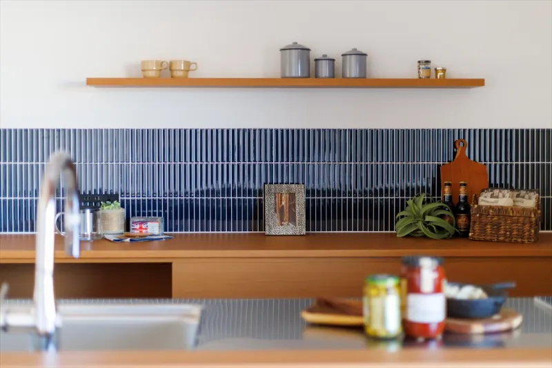 毎日立つ場所だからこそ、一番のお気に入りを。縦ラインが美しいボーダータイルが、キッチンの空間を引き締めます。