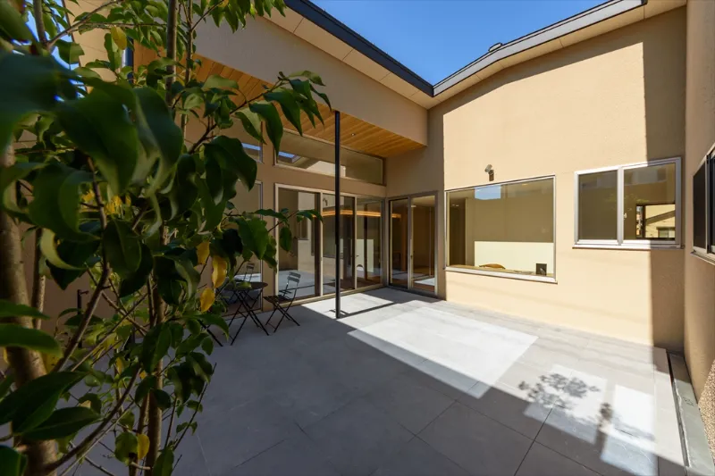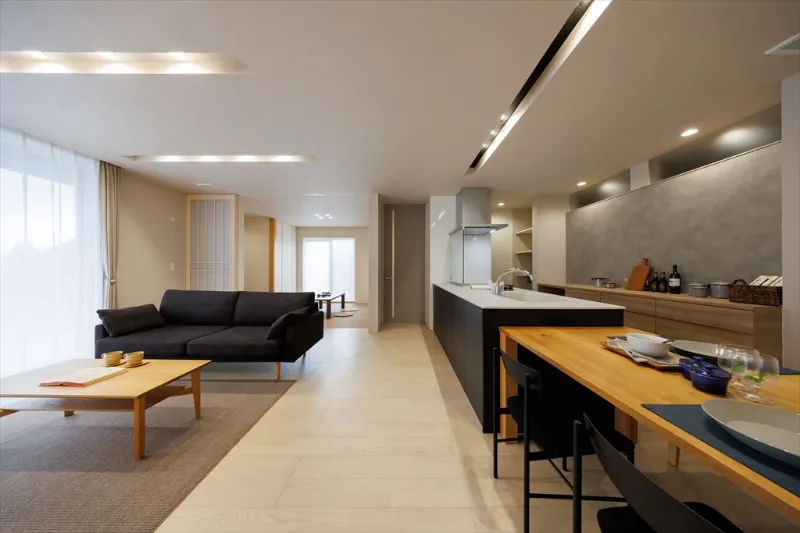 大きな平屋は建物の中央まで外光が届きにくく、暗くなりがち。こちらの邸宅は中庭やプライベートテラスを配置することで、この問題を解消しました。周囲の視線を遮りながらも、家のどこにいても光と風を感じられる。平屋ならではの開放感と安心感を生み出せるようこだわった設計です。
