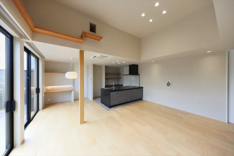 最初に紹介するのは、白と木目を基調とした、清潔感あふれるリビングルーム。