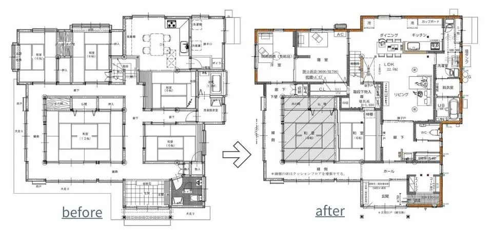 ・和室ばかりだった内部も洋室に改装。無駄な廊下を省いて家族が集うLDKを広くしました。