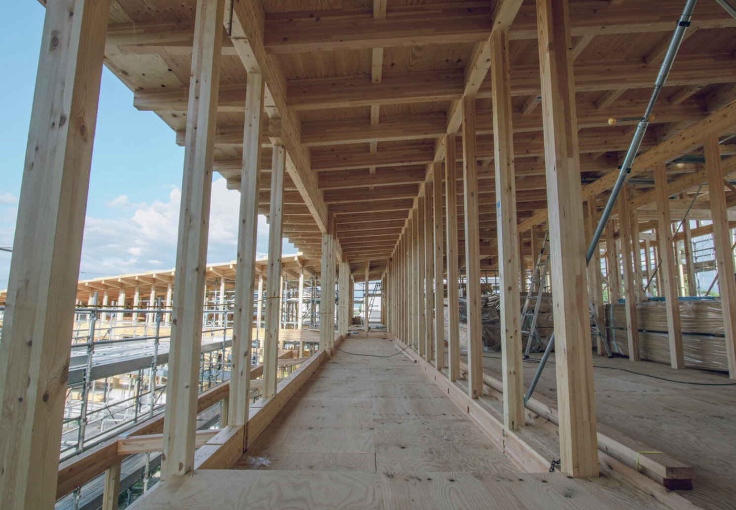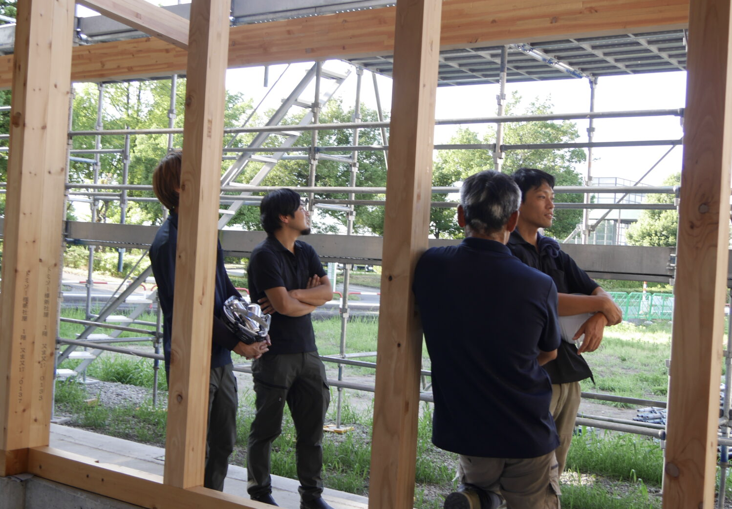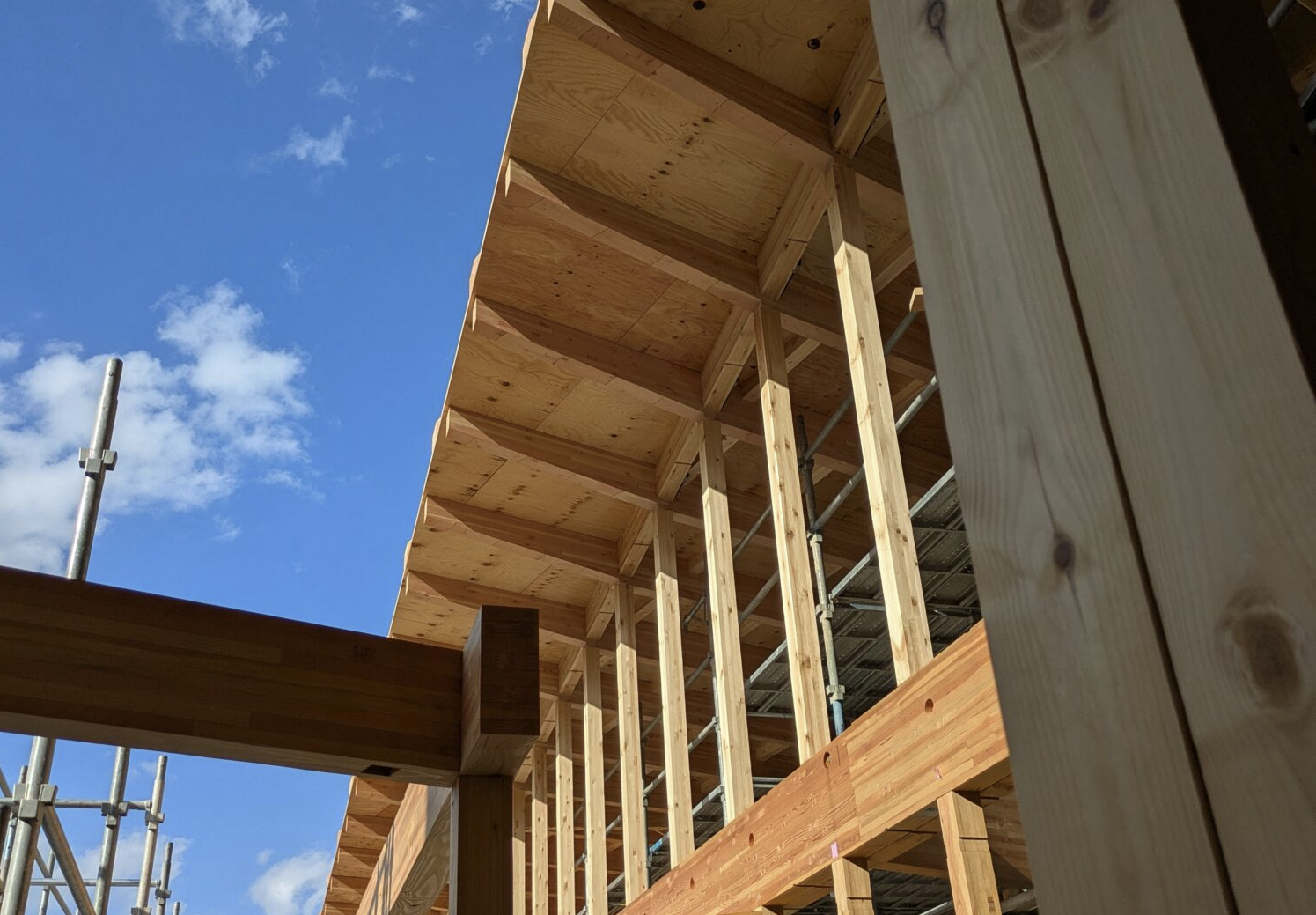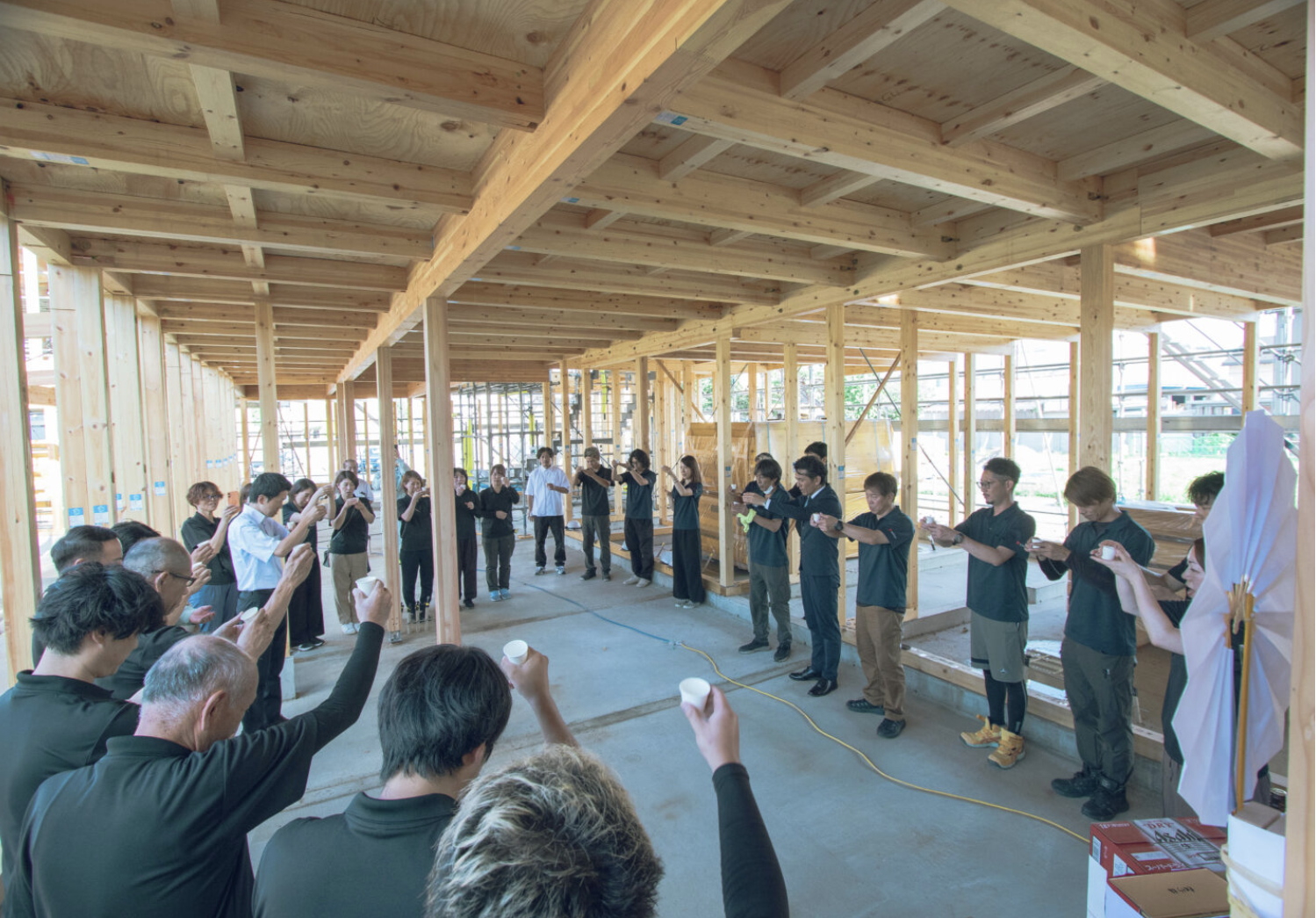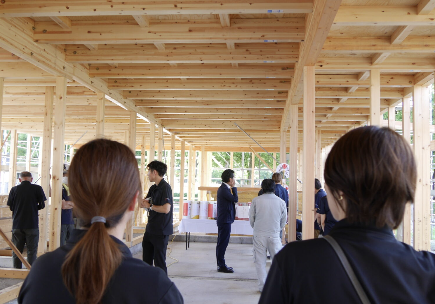 この時点では、骨組みがすべてむき出しの状態です。上棟式を終えると、いよいよ壁が立ち、外壁や内装の工事が始まっていきます。つまり上棟直後は、“構造そのものの美しさ”が一番よく見える瞬間でもあります。今回の新社屋は建物が斜めに落ちていくような独特の設計になっています。その分、構造計算にかなりの時間を費やしました。実際に構造が形として立ち上がった姿を前にすると、一直線に並ぶ梁の美しさに思わず見入ってしまいます。「いいものをつくるために、妥協はできないんだ」と改めて心に刻む時間にもなりました。
