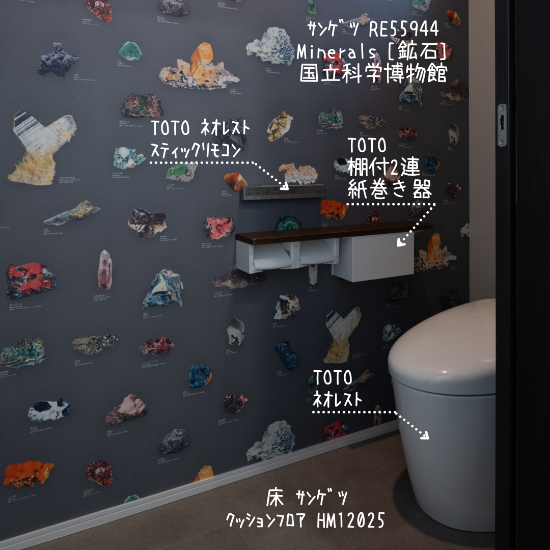 トイレはサンゲツの国立博物館とコラボレーションした「鉱物」モチーフのクロスを