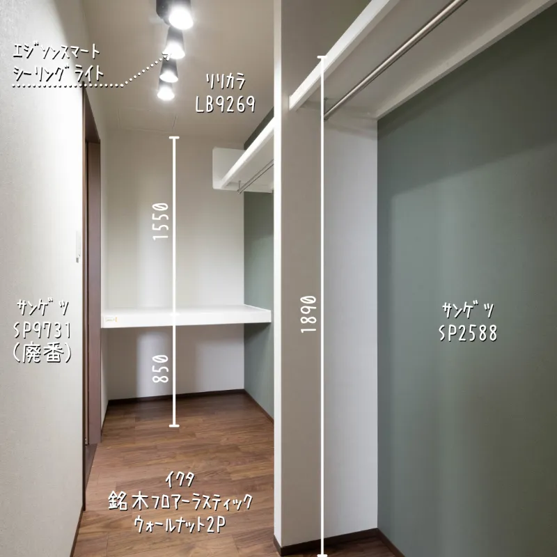 白メインの空間にオリーブグリーンのクロスがアクセントのおしゃれなウォークインクローゼット。