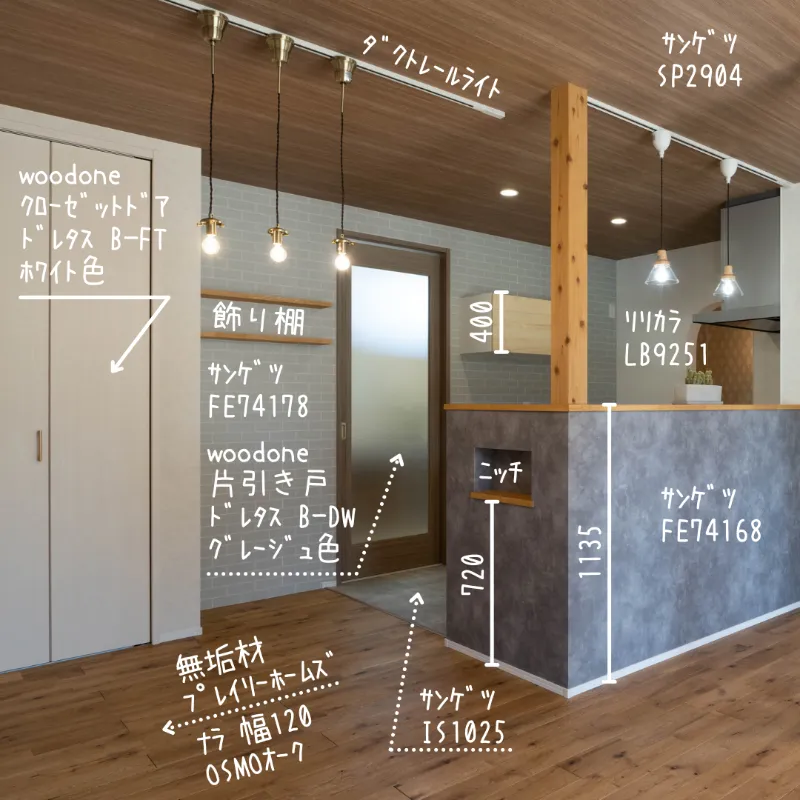 キッチンのアクセントクロスはグレーのタイル調にし、腰壁のクロスもコンクリート調のものを選択。