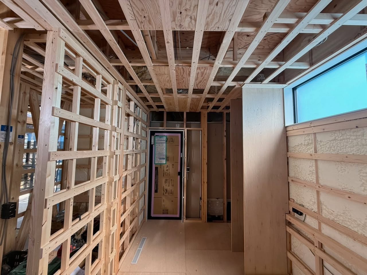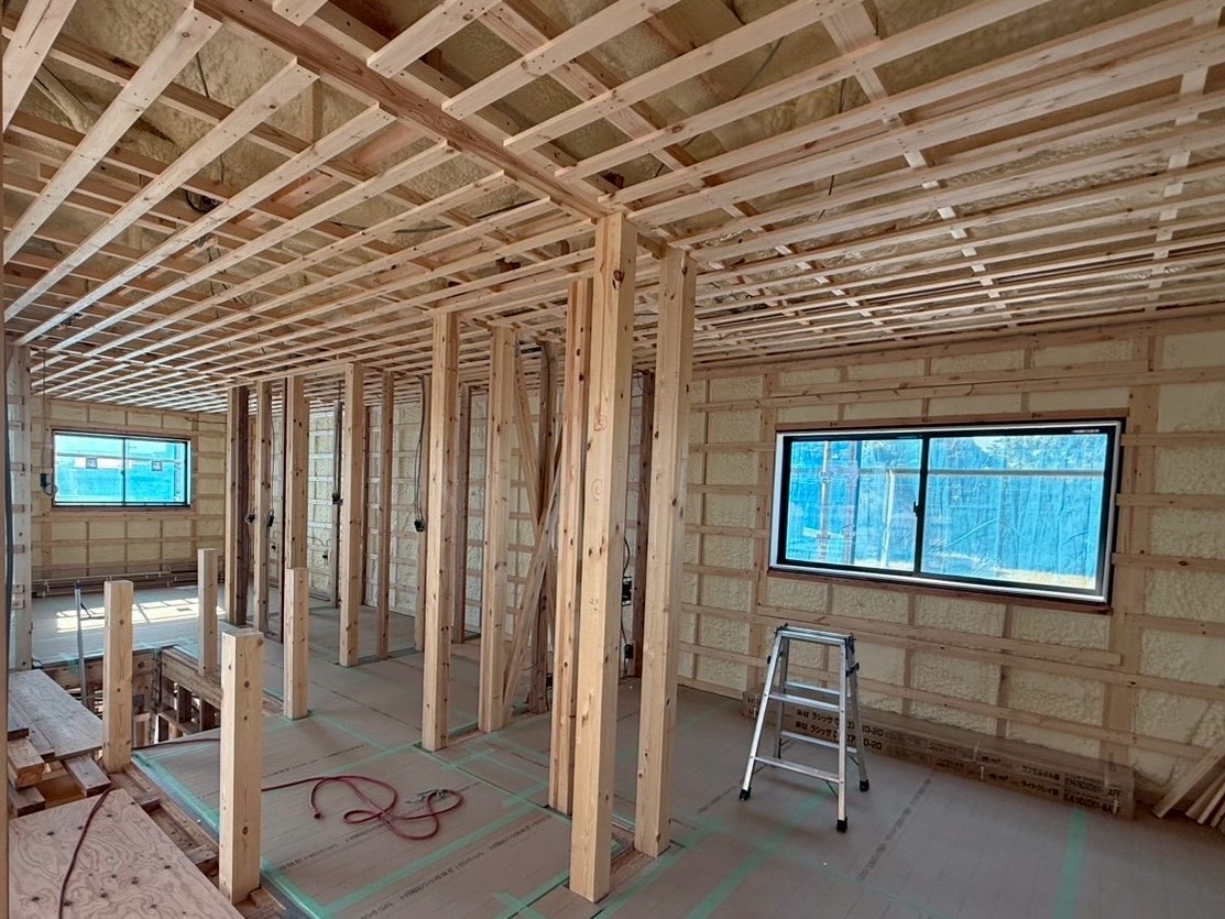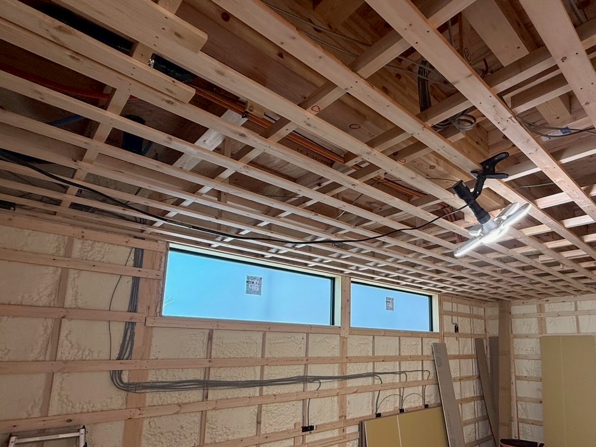 壁面の断熱工事も完了し、天壁の下地や造作部分の大工工事が進んでいます。同時に電気配線も施行中です!完成後には見えなくなる部分こそ丁寧な配線と施工が重要です!