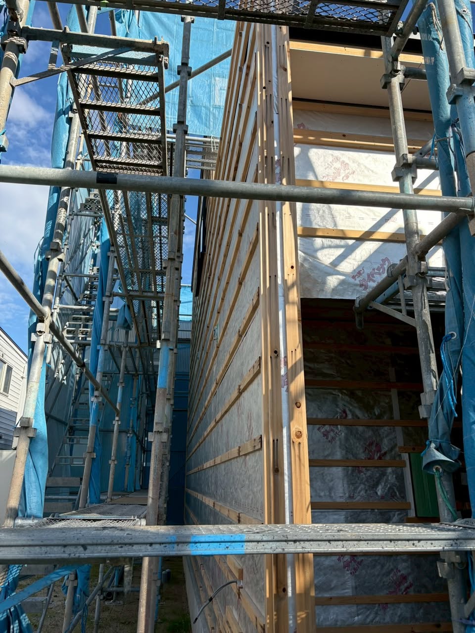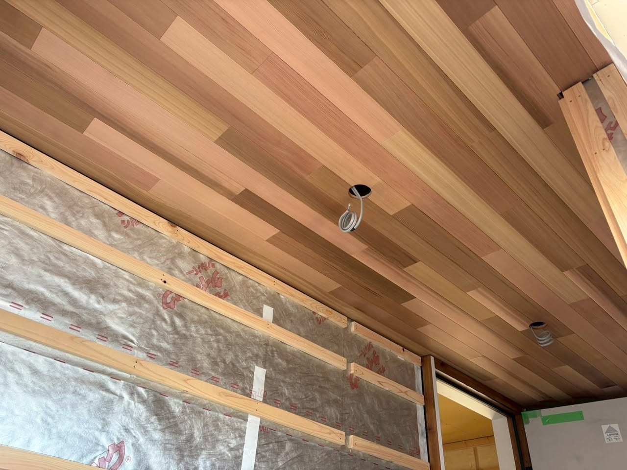 外部は下地が終わり、次は壁面のサイディング工事です!本格的な冬になる前に施工ができそうです。玄関の天井には羽目板を施しました。柾目と色合いがきれいですね。
