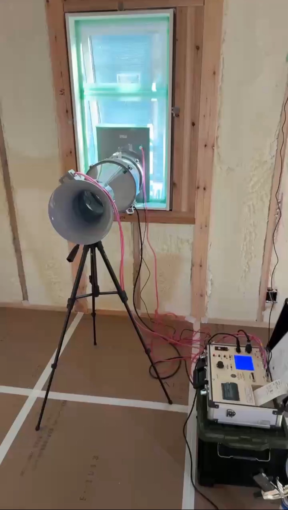 写真にあるような大きな送風機を使って、室内の空気がどれだけ外へ漏れるかを測定します。