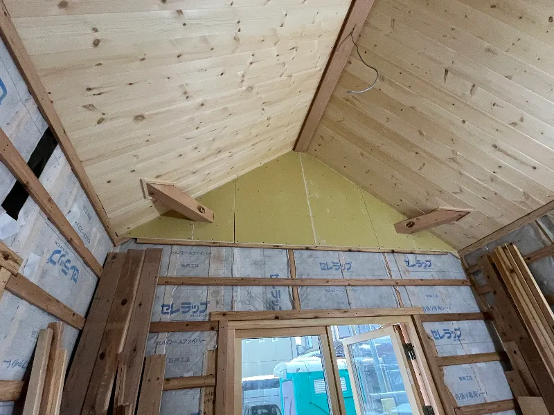 壁の断熱材(セルロースファイバー)が全て入ったので、ボードが張られる作業に入りました。