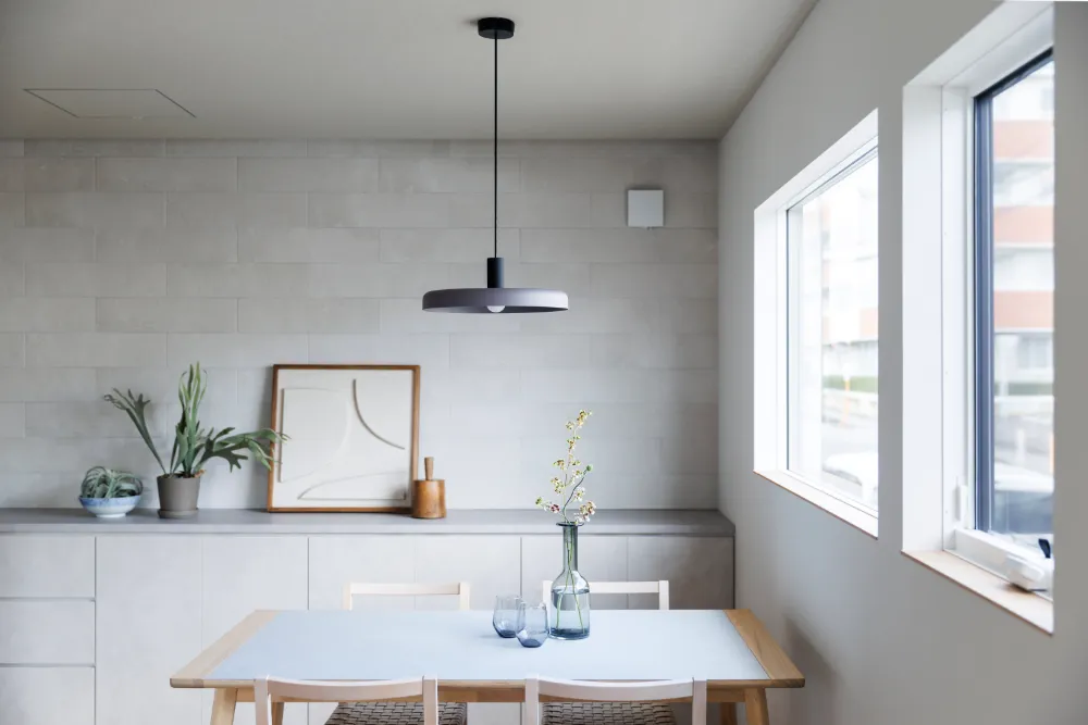 玄関に入ると真っ先に目に飛び込んでくるガラス戸。ガラス越しに見えるタイル張りの柱が、美術館のような雰囲気を漂わせる。
