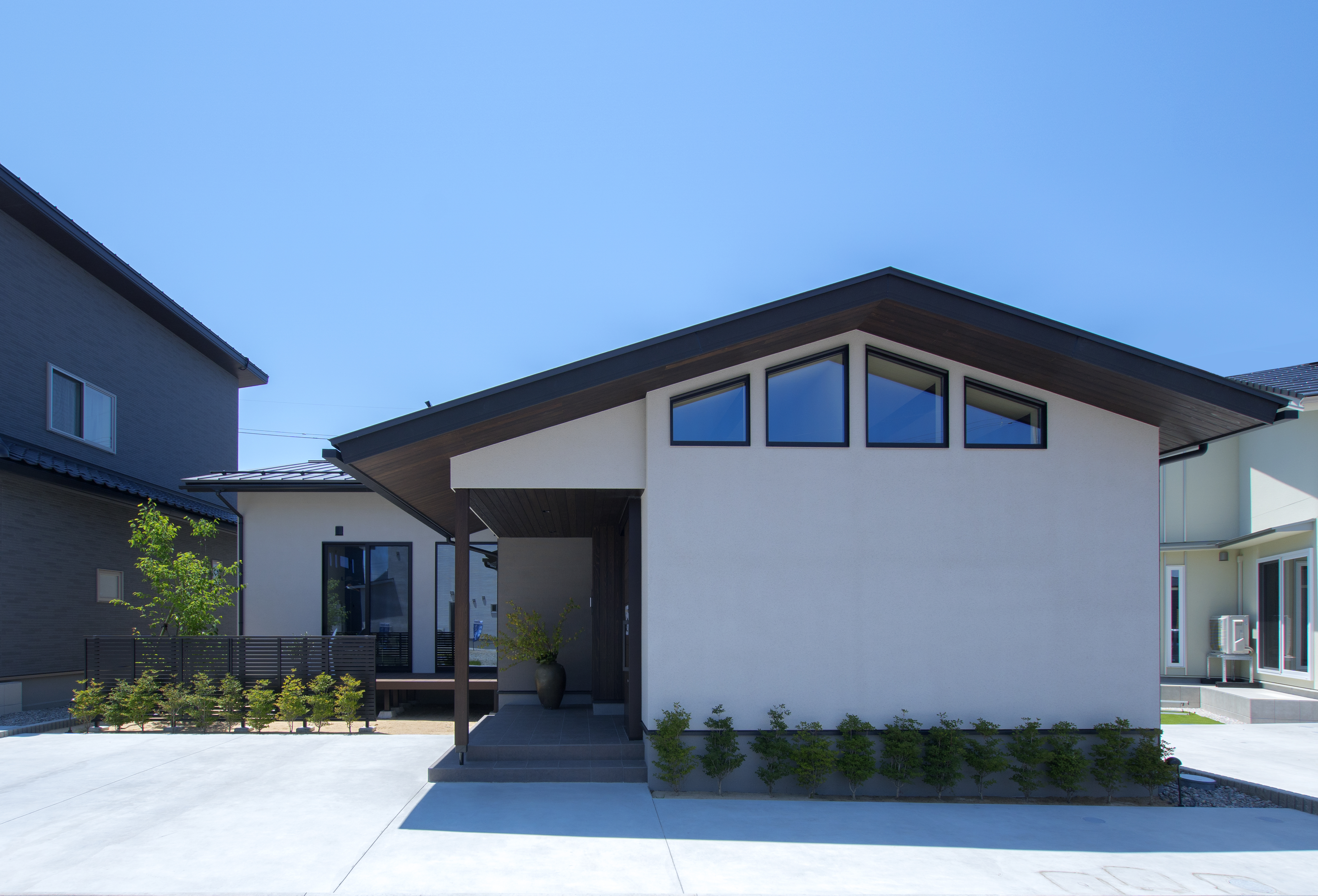 軒天とドアを木目にすることであたたかみを感じるデザインになりました。