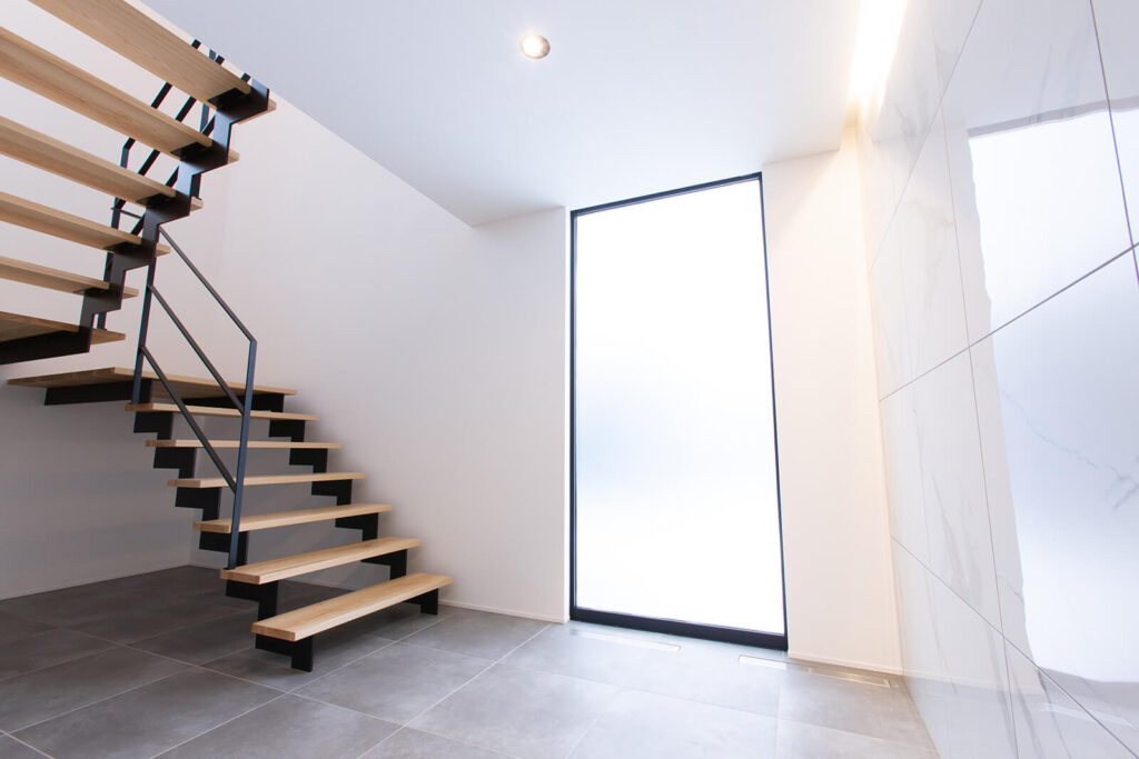 1階から2階へと続く階段も、床材と色味を合わせた温かみのある木材で架け替えました。 白い壁とのコントラストが、空間全体に清潔感と広がりをもたらします。