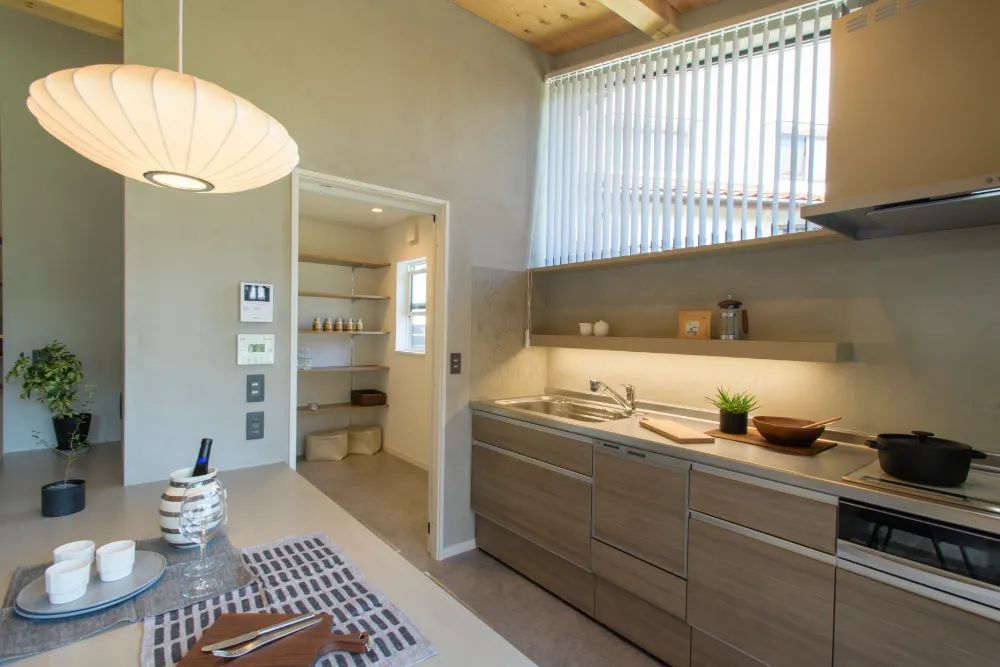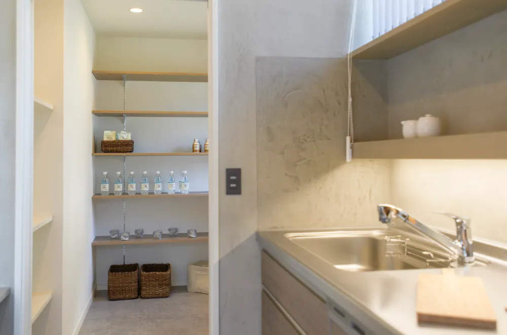 キッチン横には大容量のパントリースペースを設けました。