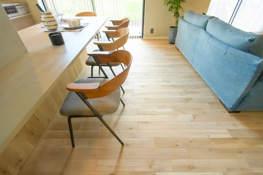 あえて塗装仕上げをせずに施工した無垢の床材がマットな印象です。