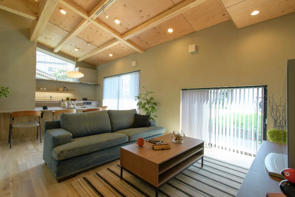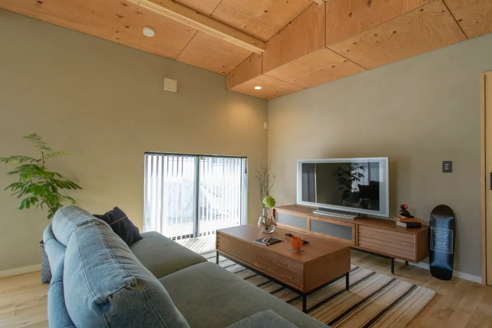 天井の梁や合板とグレー色の漆喰塗り壁の相性が良いリビング。