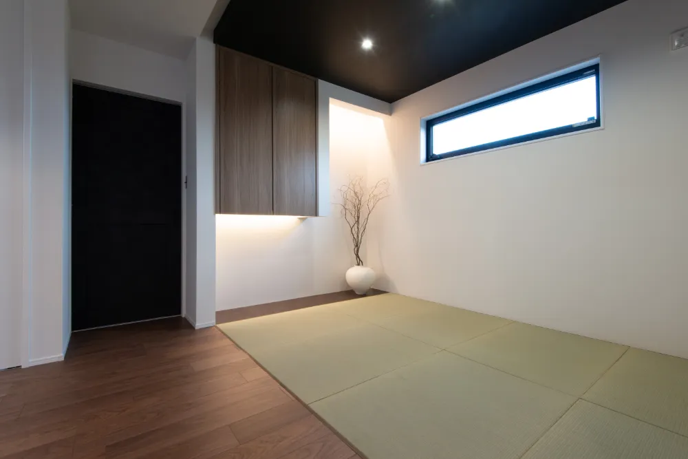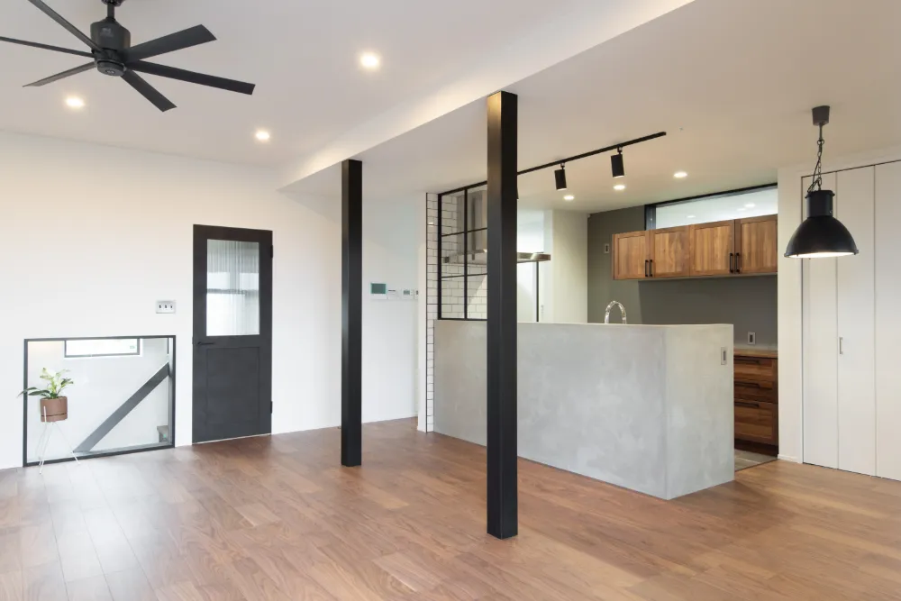 リビングの一部を土間にし、中央にクローゼットを設けたLDK。土間にはキャンプチェアを置いたりバーベキューなどをして楽しみ、クローゼットには趣味であるキャンプ用品をしまっておくことができるように土間側からもクローゼットを開けられるようになっています。
