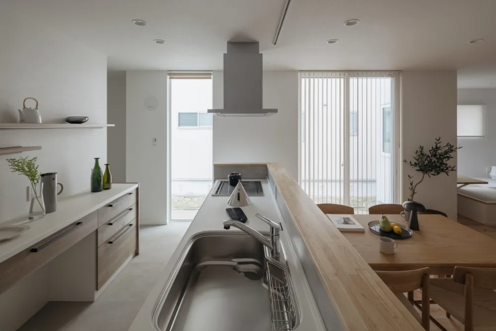 窓からの光を反射する白と、明るい木目を基調とした清潔感あふれる空間。 手元を隠しつつ配膳に便利な造作の木製カウンターが、機能美と心地よいリズムを生み出しています。