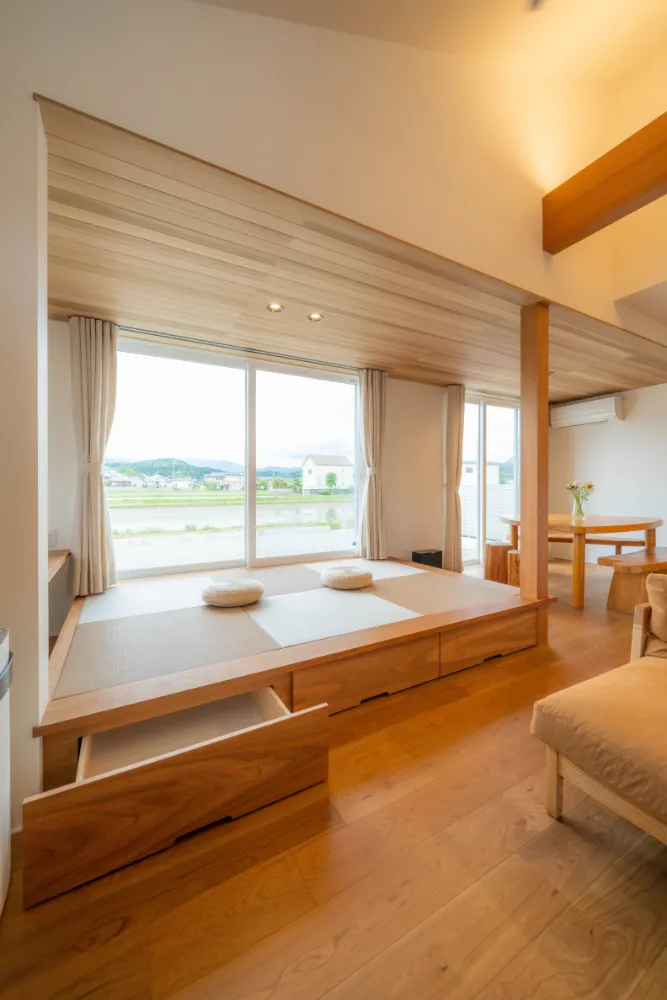 座敷の書院から見える桜。 対面にあるガラスブロックの明かりが障子越しに届きます。 障子をほんの少し開けるだけで絵になる空間に