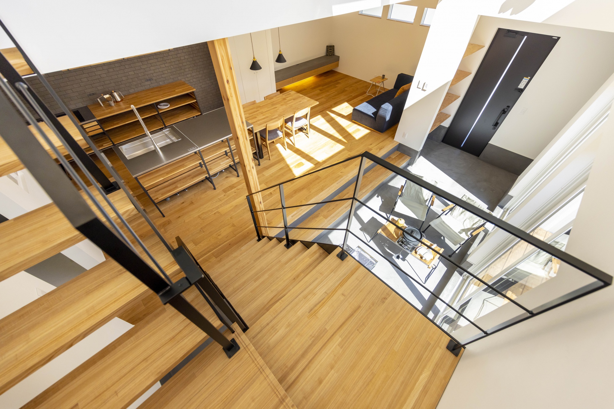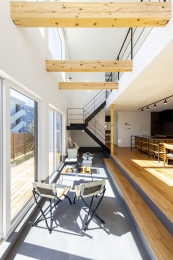 2階からは吹き抜けをとおして土間やウッドデッキで過ごす家族の様子もよくわかり、 お互いの気配感じながら各々の時間を過ごすことができます!