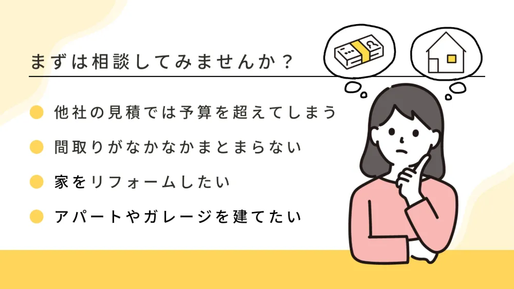 他社で見積書を出してもらったら予算を超えてしまったという家族に寄り添い、住まいのセカンドオピニオンとしてサポートします。見積もりやプランを客観的にチェックして予算と要望の両方を叶える住まいを改めてご提案いたします。