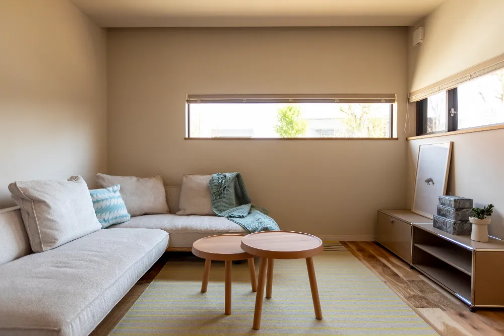 低めの家具と横長の窓が、空間に落ち着きをもたらすリビング。 外からの視線を抑えつつ、やわらかな光を取り込むことで、 一日中、穏やかな時間が流れます。