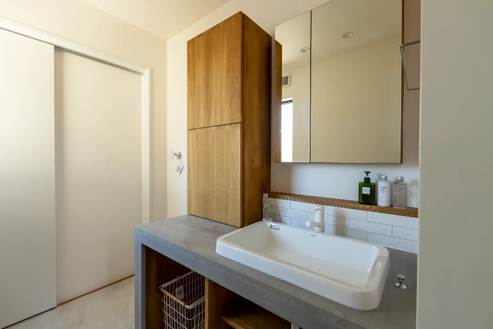 造作洗面ならではの、すっきりと美しい佇まい。 カウンターや収納には木の素材感を生かし、 朝の支度や帰宅後の手洗いも、気持ちよく使える場所に仕上げています。
