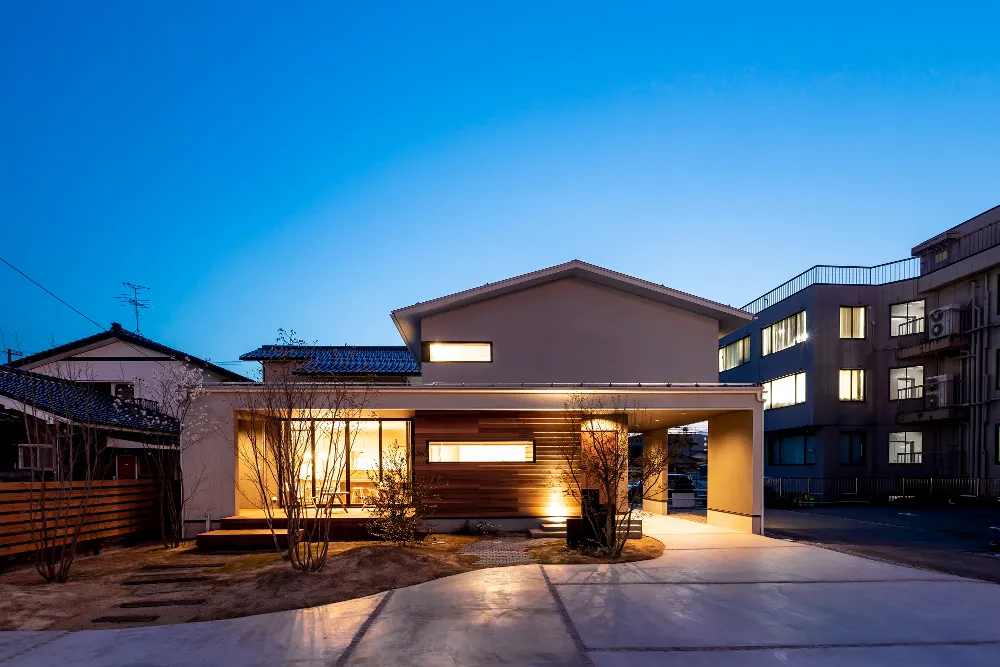 夕暮れとともに浮かび上がる、やさしい灯りの外観。 木と塗り壁の素材感が引き立ち、 帰ってくるたびに、ほっと安心できる佇まいです。