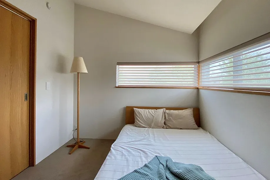 必要なものだけを置いた、静かで落ち着いた寝室。 横長の窓から入る光が、朝の目覚めをやさしくサポートします。 一日の疲れをしっかりと癒せる、シンプルな空間です。