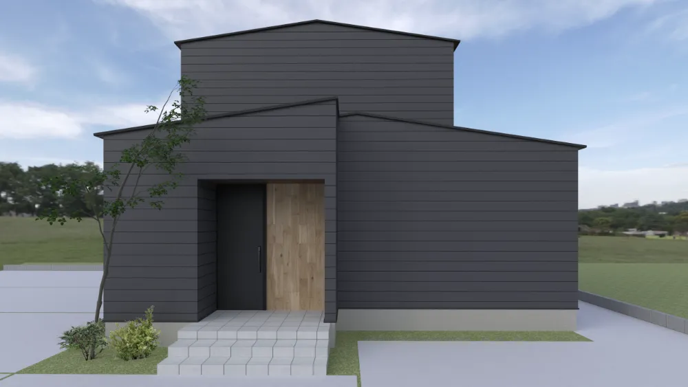 ・ダークトーンの外壁の中で、本物の木を使った羽目板のアクセントが視線を集める温かい印象を与えます。