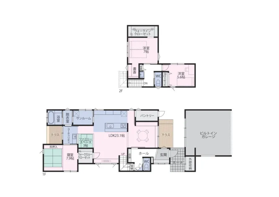 小上がり畳スペース (3畳): リビングに隣接し、お子様の遊び場やお昼寝も使えるスペース。 • パントリー (3畳): キッチン横にあり、勝手口があり、ガレージから直接アクセス可能。 • 寝室 (7.9畳)