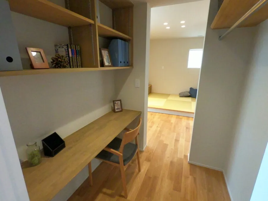 寝室からリビングへと通り抜けできる機能的な収納。ワークスペースとしても利用可能です。