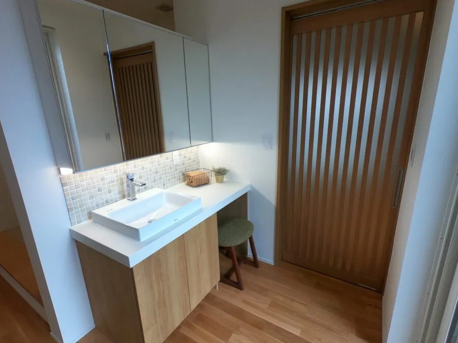 デザイン性の高い造作洗面化粧台は2人並んで使えます。浴室はゆったり寛げる1坪サイズ。