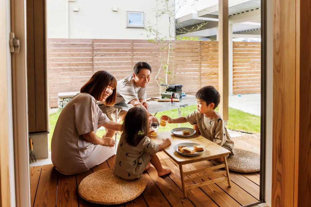 2枚の窓が大きく開き、庭遊びを楽しめるよう屋根付きデッキを設けました。デッキ横には常にBBQコンロを置いておける空間があり、キッチンからの動線も抜群です。