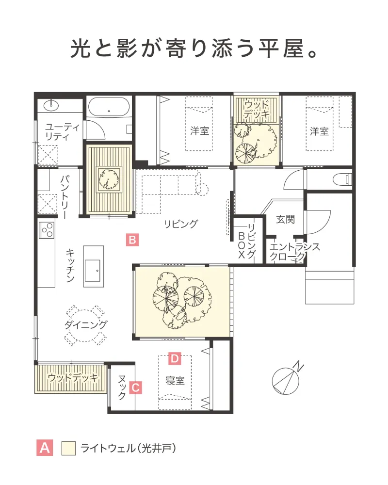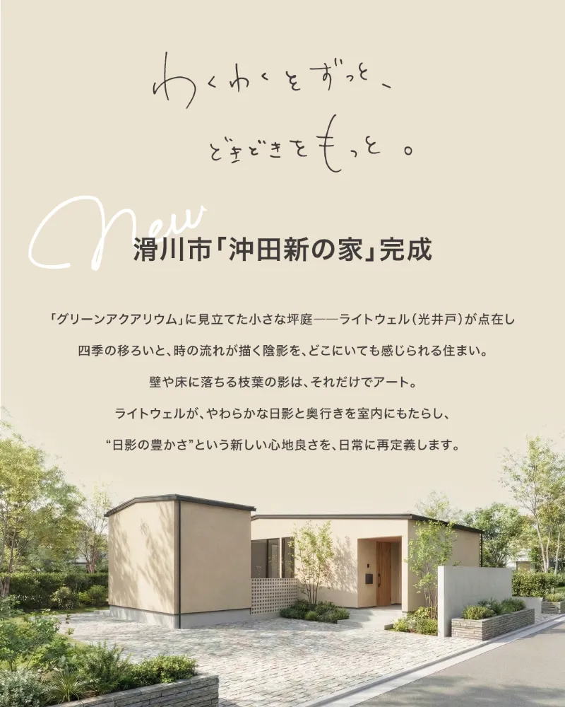 ライトウェル(光井戸)が点在し、四季の移ろいと時の流れが描く陰影を、
