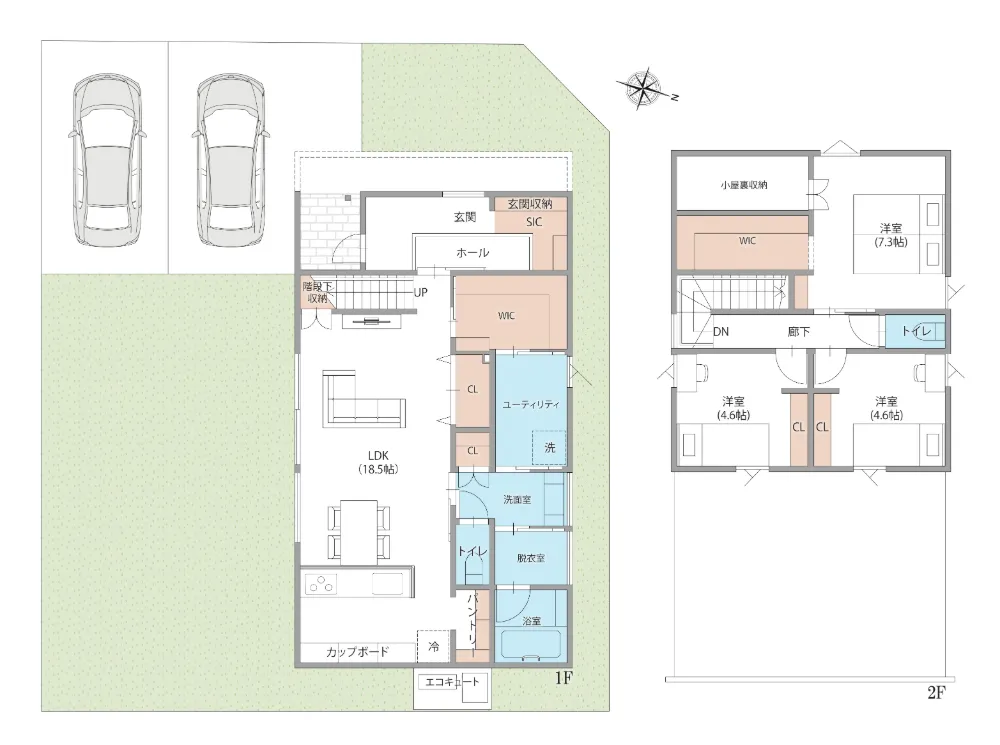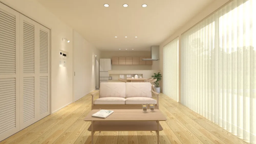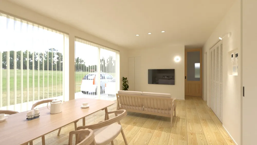 玄関からキッチン、洗面室、リビングへと回遊できる動線設計で、 買い物帰りの片付けや、朝の身支度、帰宅後の動きがスムーズにつながります。 遠回りのない動線が、毎日の小さなストレスを自然と減らしてくれる間取りです。 収納も“とりあえず確保”ではなく、使う場所のそばに配置することで、 片づける場所に迷わず、暮らしが自然と整う設計に。 動線と収納をセットで考えることで、広さ(坪数)に頼らず、 設計次第でここまで暮らしやすくできることを体感できます。