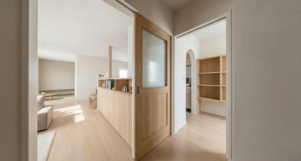 キッチンを中心に回れる動線と、水回りとファミクロを行き来しやすい、2つの回遊動線。 (上記画像は、玄関ホール→リビング→キッチン→パントリー→玄関ホールへの回遊動線) 子どもの動線と重なりにくい間取りで、毎日の家事も効率よく進められます。