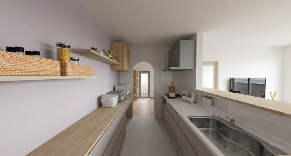 キッチンから食品庫、さらに勝手口へとつながる動線。 買い物後の荷物の収納やゴミ出しも、玄関からではなく勝手口からスムーズに行えます。