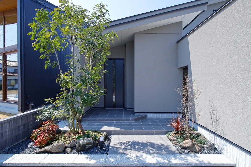 塀と車庫のゲートで両サイドを締め、「ステージ」のようにデザインしたタイルのアプローチ。 バランスよく配置されたシンボルツリーと植栽が街に潤いを与え、帰宅時も四季を感じ気持ちを安らかにしてくれます。