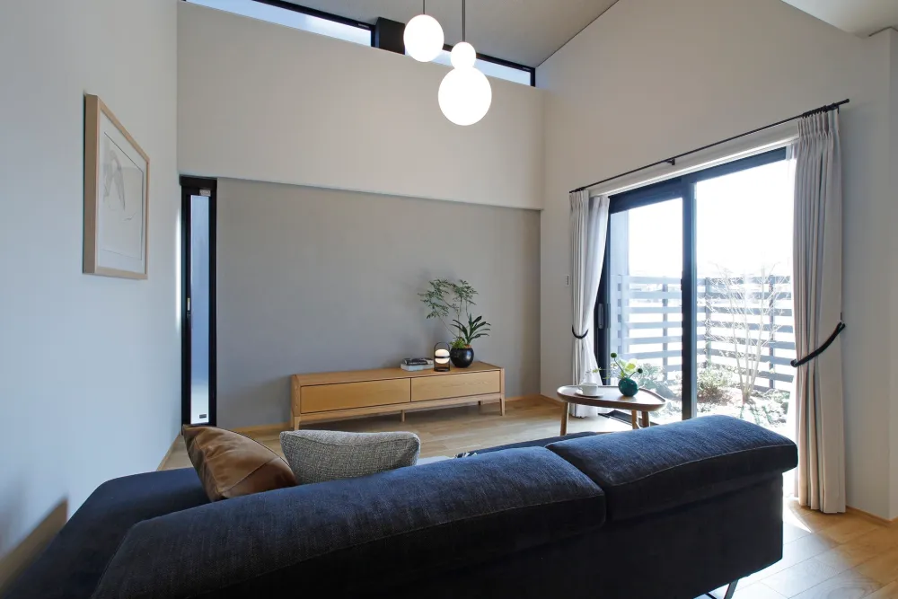 高天井+庭とのつながりで、より広々と感じるリビング空間。 壁に段差を付けラインを通すことで間延びしがちな壁面を引き締めてくれます。