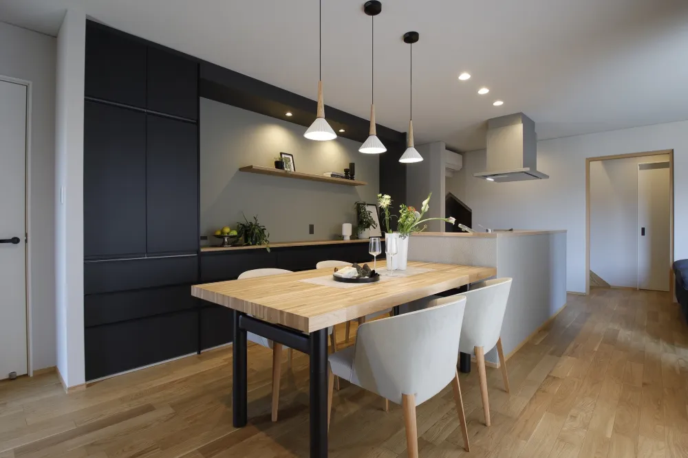 キッチンで料理するときも、ダイニングで食事をするときも庭が視界に入り安らぐ空間になっています。 カップボードはダークカラーを効かせることで、すっきり感と心地よさを両立させました。色やラインを整えているため、好きなものを自由に飾っても美しくまとまりま
