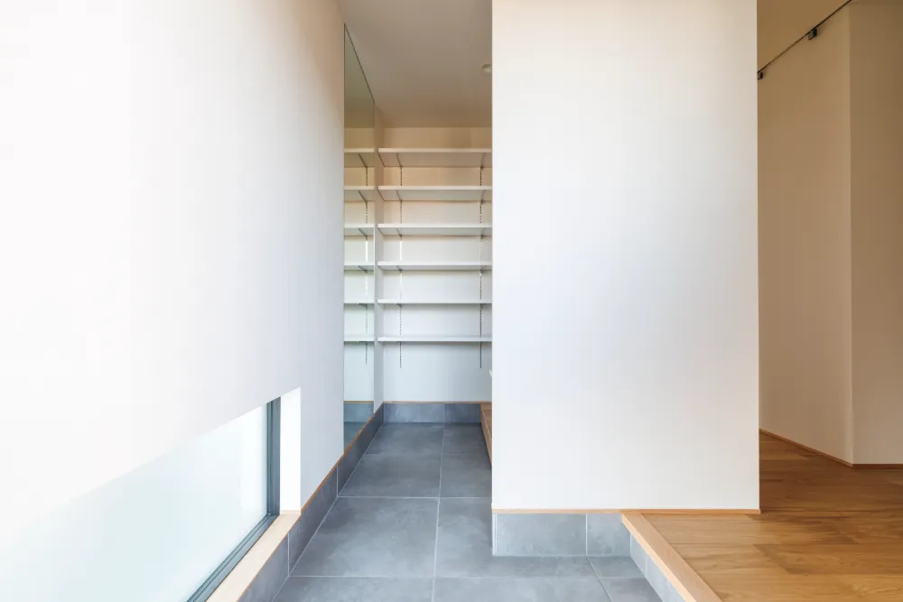 キッチンと横並びのパントリー 自在に高さを変えられる可動棚を取り付けました