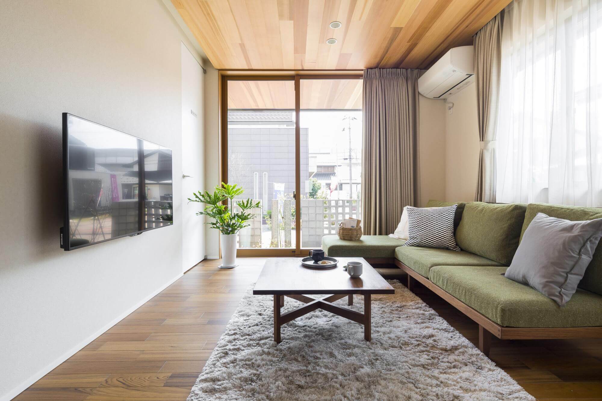 平屋の暮らしが体感いただけるスペースのリビング。天井板がアクセントとなり、上質でやすらぐ空間を演出。