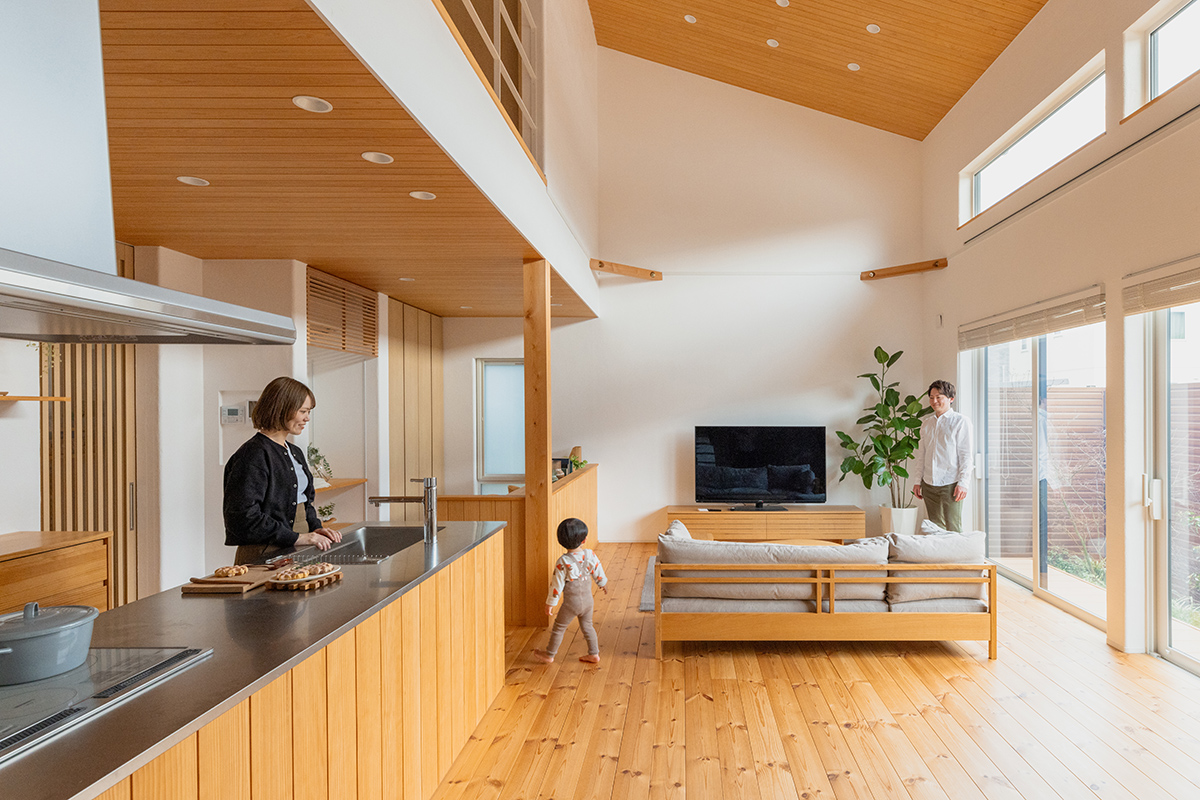 大きな吹き抜けと大開口サッシで室内のどこにいても光と風を感じられる設計