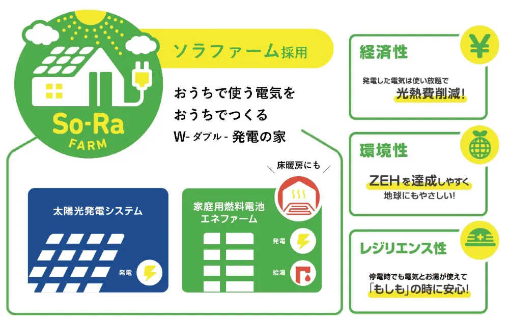 太陽光発電+エネファーム採用で、おうちで使う電気をおうちでつくるW発電の家。家計や環境にもやさしく、停電時でも電気とお湯が使えて、「もしも」の時に安心!