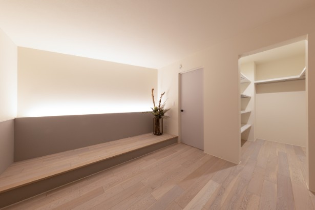 プライベート空間は2階に、家族共用スペースは1階に集約し大きな回遊型にすることで、機能的な動線を実現。主寝室はダウンライトを設けず、間接照明とフロアライトのみで過ごせる落ち着いた空間に仕上げました。
