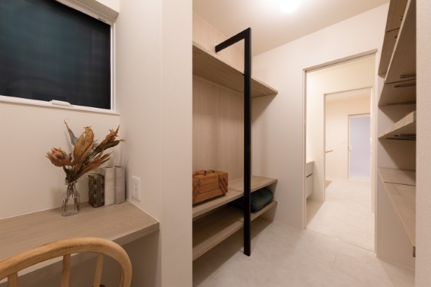 パントリー→クローゼット→洗面→脱衣室の一直線の動線。1階の収納量を確保しつつ、家族の集うLDKはスッキリとまとめました。