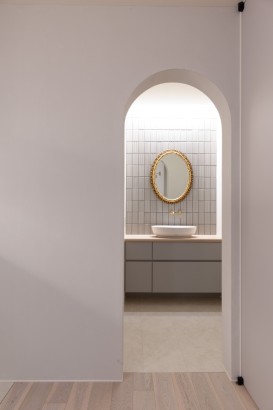 洗面への入口はアールの加工を施しました。空間を美しく演出します。